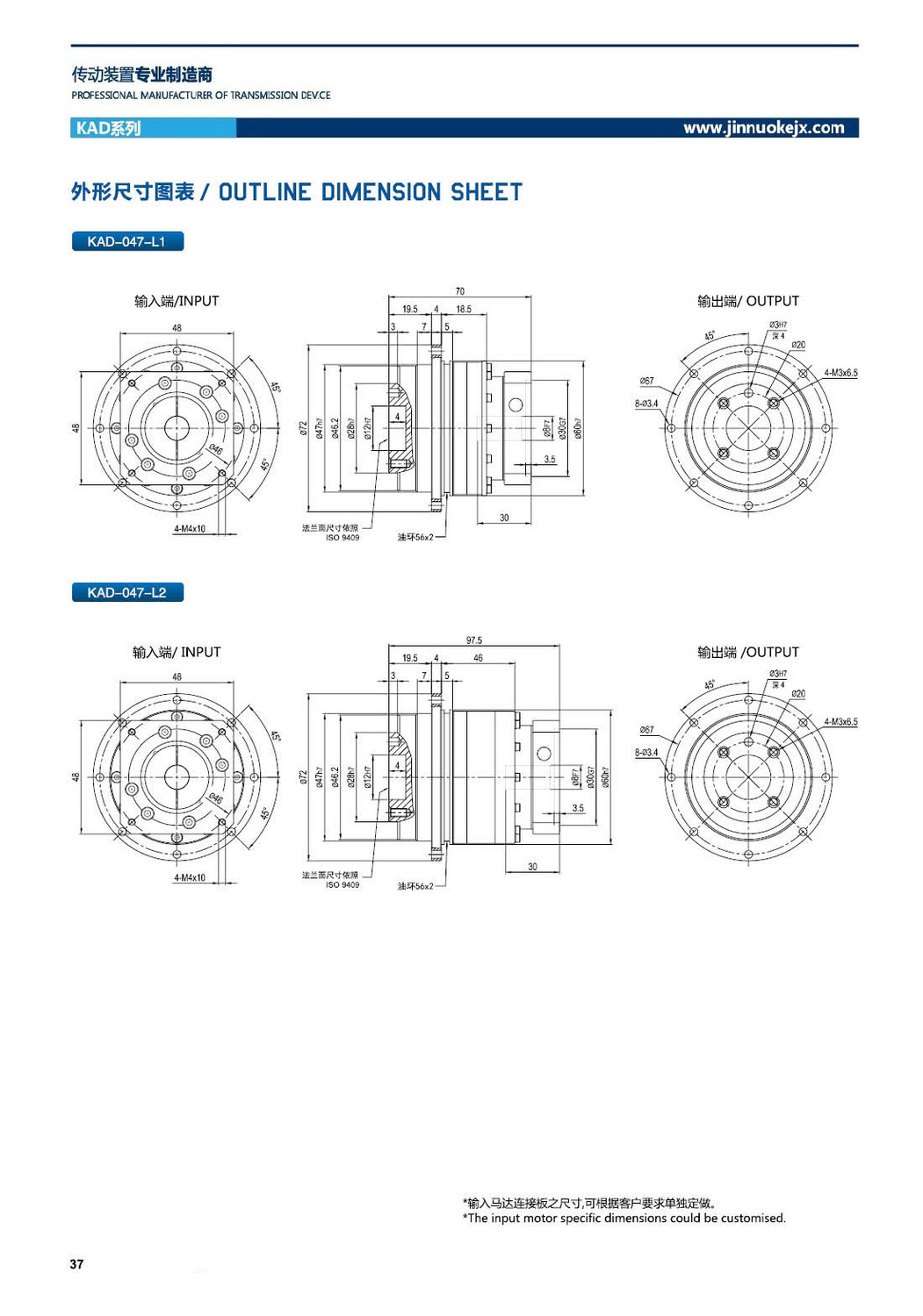 KAD047斜齿精密行星减速机具有高精度、高剛性、高負載、高效率、高速比、高寿命、低惯性、低振动、低噪音、低温升、外观美、结构轻小、安装方便、精确定位等特点。适用于交流伺服马达、直流伺服马达、步进马达、液压马达的增速与减速传动。 注:減速機輸入端法蘭尺寸,可依馬達的法蘭面進行特殊定制. 备注:如因分辨率不同或者其他原因导致字体不清晰,可通过以下方式改善:1、拖拽资料图片,使用鼠标滚轮放大查看;2、将资料图片下载至本地后再进行查看。